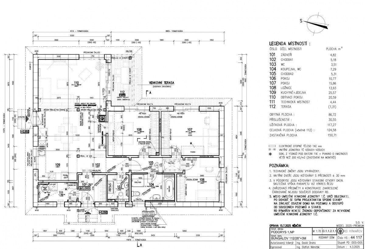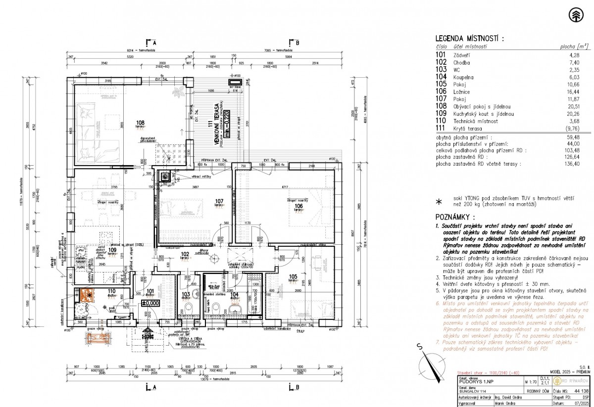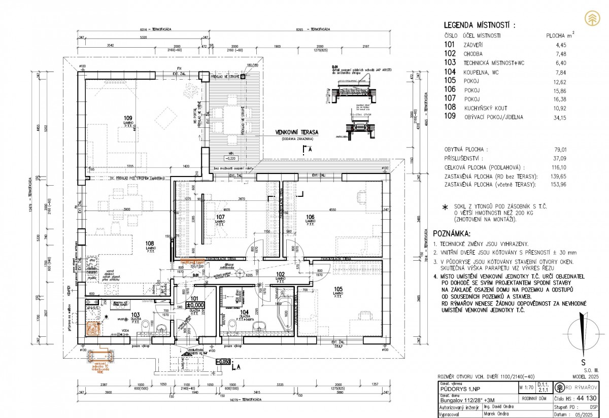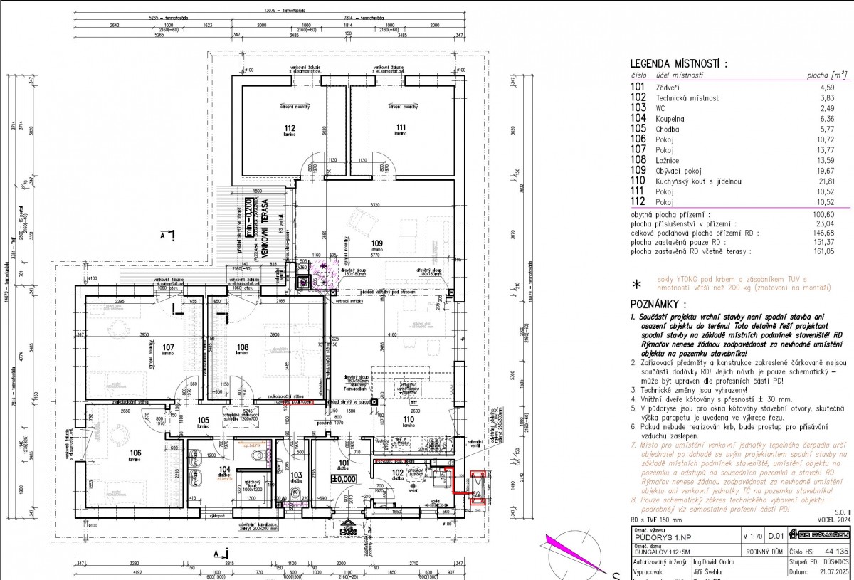 - obvodové stěny s vnitřní izolací 120 + 40 mm a vnější termofasádou 150 mm uzavřenou strukturní barevnou omítkou