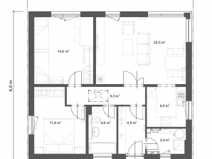 Půdorys nízkopodlažního domu Bungalov 72 S Vás potěší svou jednoduchostí. Rozměry 9,9 × 9 m a sedlová střecha činí z tohoto domu ideálního kandidáta do jakékoliv zástavby. Srdcem domu je obývací pokoj spojený s jídelnou s přímým vstupem do kuchyně. Tento prostor je díky několika velkým oknům prosvětlený a vzdušný. Zároveň poskytuje přímé spojení s venkovní terasou a zahradou. Mysleli jsme i na praktickou technickou místnost.